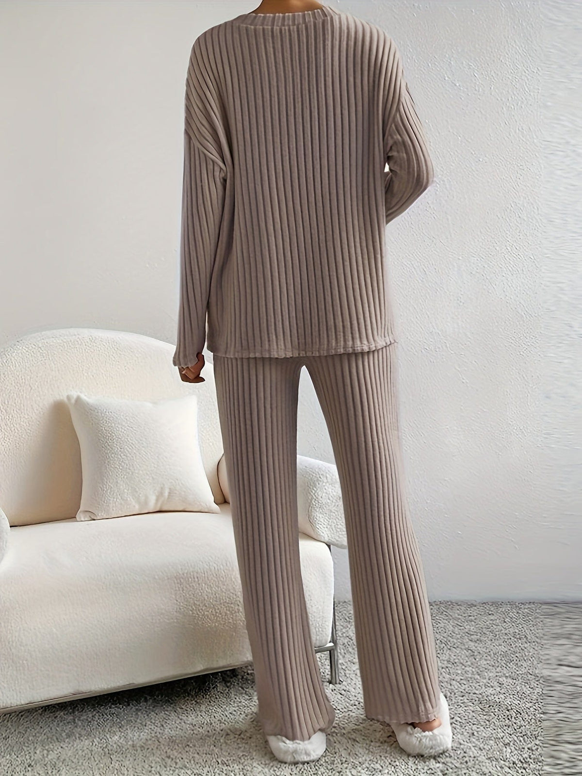 Solid Ribbed Casual Pants Set for Women's V-Neck Long Sleeve Top & Pocketed Straight Leg Pants